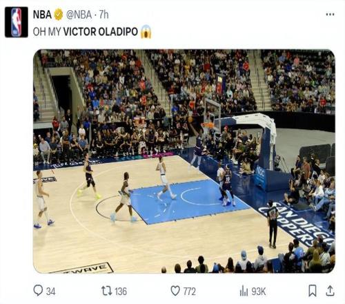 这场比赛奥拉迪波完成了一个单臂空接暴扣,他的头险些撞到篮筐,NBA官方都写道:OH MY 奥迪(惊呼表情)。