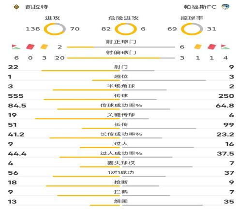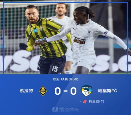 雷速体育10月22日宣 25/26赛季欧冠联赛第3轮,凯拉特0-0互交白卷闷平帕福斯FC。开场仅4分钟,科里亚便因为严重犯规被直红罚下,帕福斯只得以10人应战。下半场比赛,凯拉特门将阿纳别科夫曾打入一粒乌龙,但因帕福斯球员越位在先进球无效,最终两队0-0闷平各拿一分。