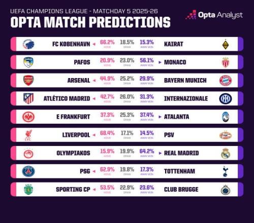 最后我们再来看看Opta超级计算机的模拟推演结果:阿森纳获胜概率44.9%,拜仁29.9%,平局25.2%。超算还是相对看好枪手的主场优势。
