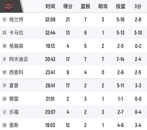 末节杨瀚森在内线连续打2个,丝滑转身扣篮,信心上来了,防守端也有贡献。不过令人担心的是,杨瀚森的脸被埃迪打到,倒在地上很痛苦,裁判没吹,灰熊继续进攻进球,斯普利特很生气,去找裁判理论,却被吹T。当阿尔达马三分投中,开拓者86-102,卡马拉回敬三分。杨瀚森不在场,开拓者失误太多,相差20多分了,比赛失去悬念。灰熊以119-96击败开拓者,数据如下:格兰特16中5得21分7板3助,阿夫迪亚17分7板7助,夏普17分,卡马拉13分6板,杨瀚森4分5板2助。灰熊队的阿尔达马11中7,进3记三分,得到22分7板1助2抢断,当选本场最佳,埃迪12分10板6失误6犯,韦尔斯、波普16分。