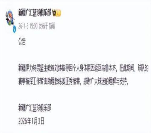 如今,第4位下课的主教练也诞生了,那就是新疆队主帅刘炜。1月3日,新疆队自己官宣了这一消息,刘炜因家庭原因返回乌鲁木齐,而接下来将由韩国籍助教姜正秀来指挥。
