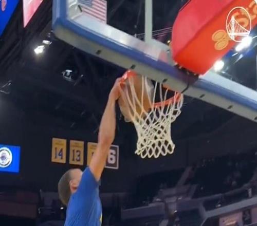 雷速体育10月18日宣 NBA季前赛继续进行,勇士将在今天的季前赛收官战中主场迎战快船。赛前热身环节,库里展示花活儿。 他以一个排球式助攻,让自己完成了自抛自扣。